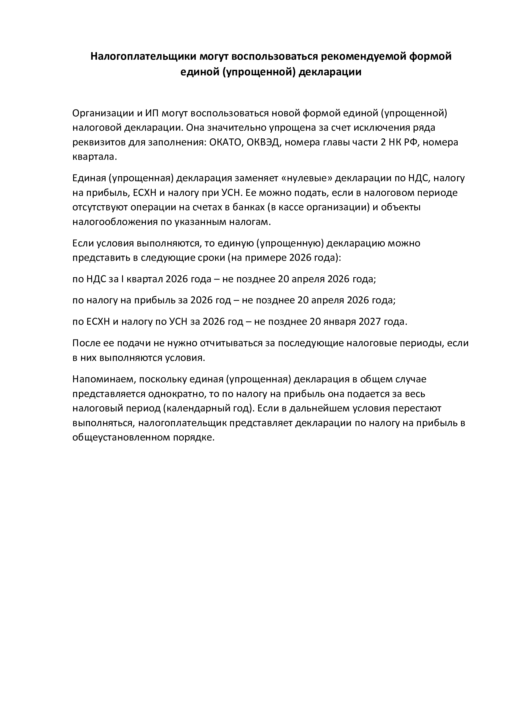 Налогоплательщики могут воспользоваться рекомендуемой формой единой (упрощенной) декларации
